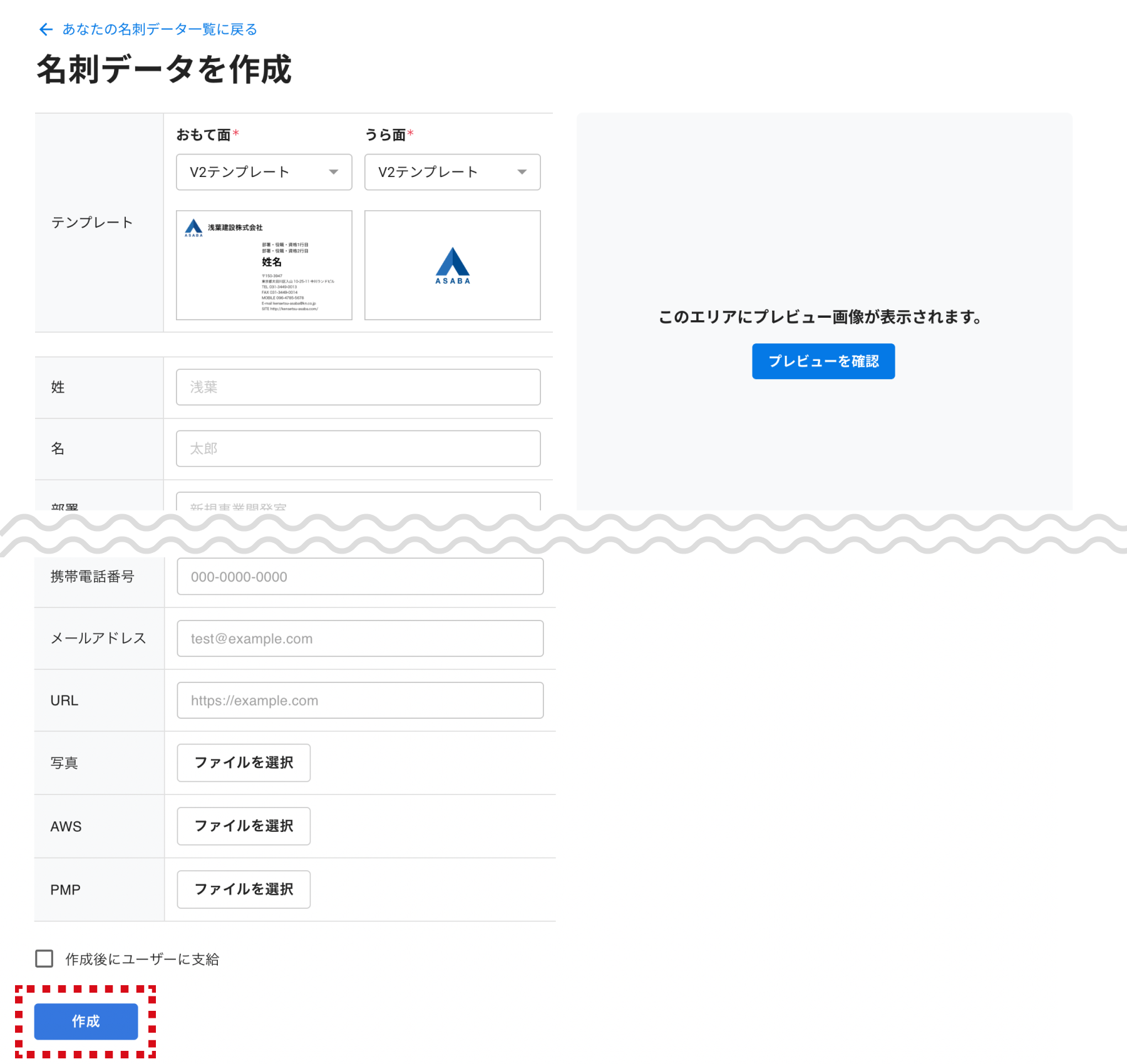- テンプレートを選択し、部署や肩書き、氏名などをそれぞれのテキストボックスに入力し、プレビューで仕上がりを確認してから作成ボタンをクリック