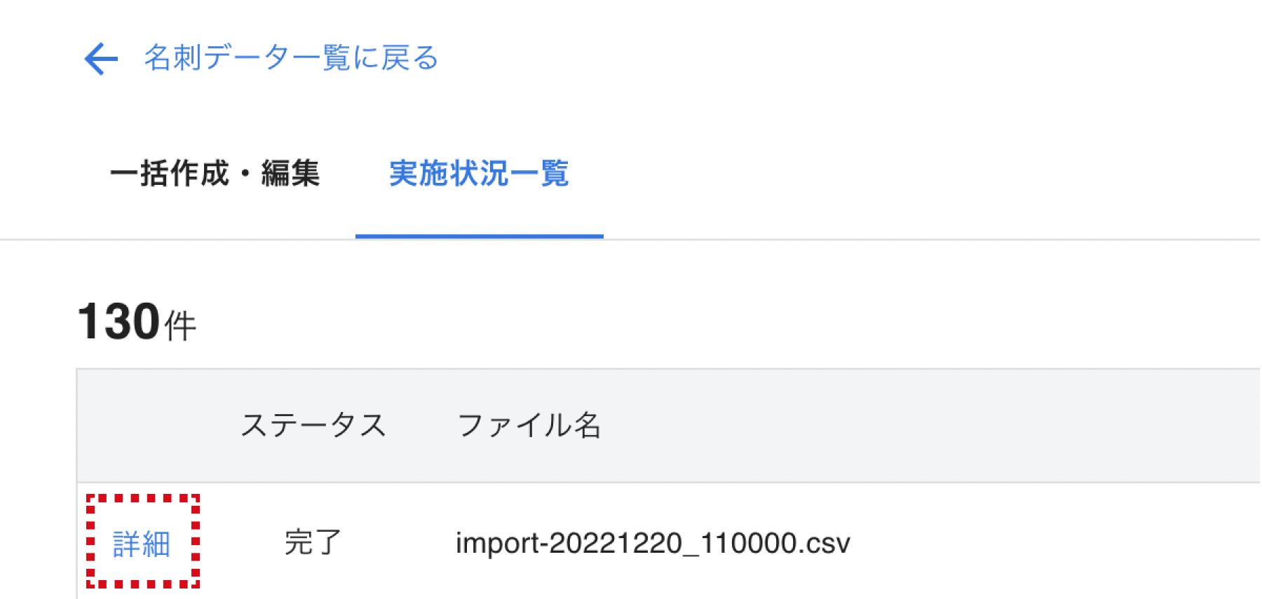 (インポートの件数によってお時間がかかる場合があります)[実施状況一覧画面] でステータスの確認、エラーの詳細を確認できます。